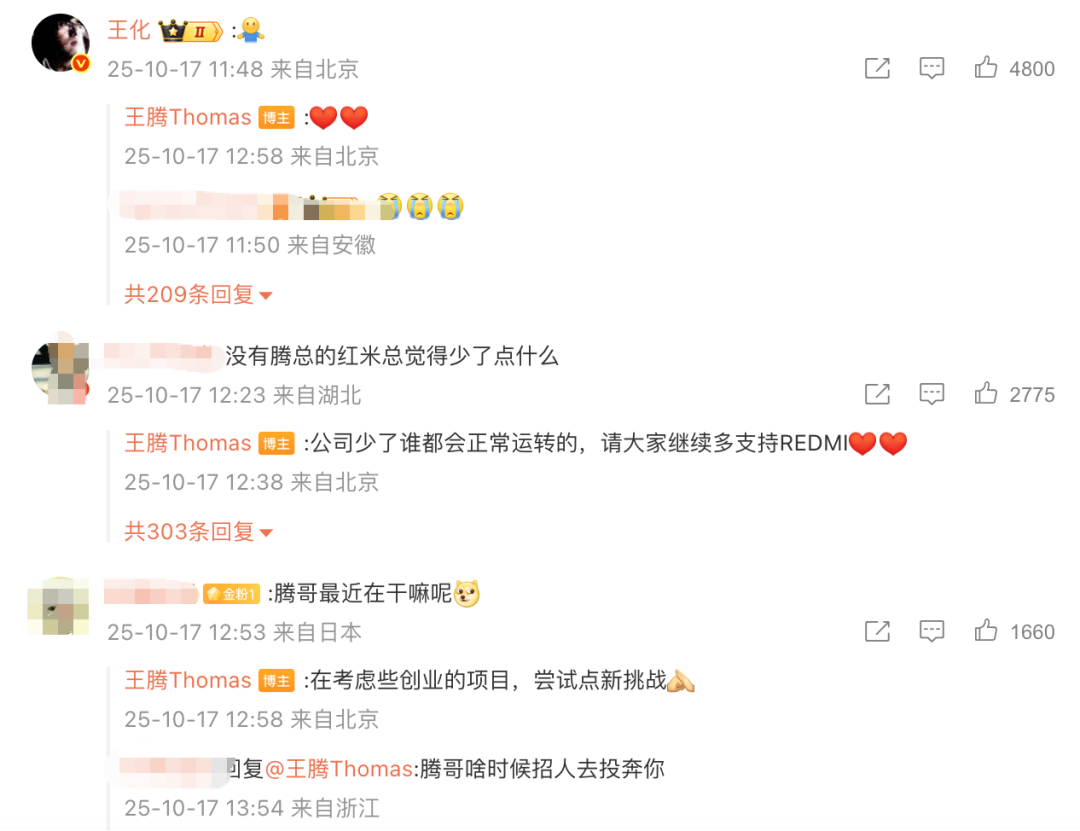 在该条微博评论区,小米集团公关部总经理王化评论区回复“拥抱”表情,王腾也回复比心表情。同时,王腾还在评论区表示最近“在考虑些创业的项目,尝试点新挑战”。