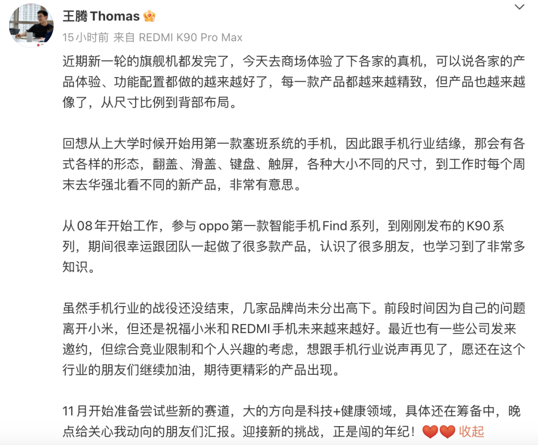 11月1日,小米前中国区市场部总经理王腾发文公布最新去向。王腾在社交平台表示,因竞业限制和个人兴趣,正式和手机行业说声再见,“11月开始准备尝试些新的赛道,大的方向是科技+健康领域,具体还在筹备中,晚点给关心我动向的朋友们汇报。迎接新的挑战,正是闯的年纪!”