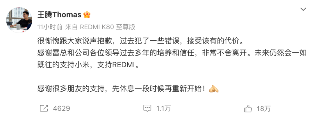 当日晚间,王腾在其微博账号上发文称:“很惭愧跟大家说声抱歉,过去犯了一些错误,接受该有的代价。感谢雷总和公司各位领导过去多年的培养和信任,非常不舍离开。未来仍然会一如既往的支持小米,支持REDMI。”同时,他还在文中透露会先休息一段时间再重新开始。