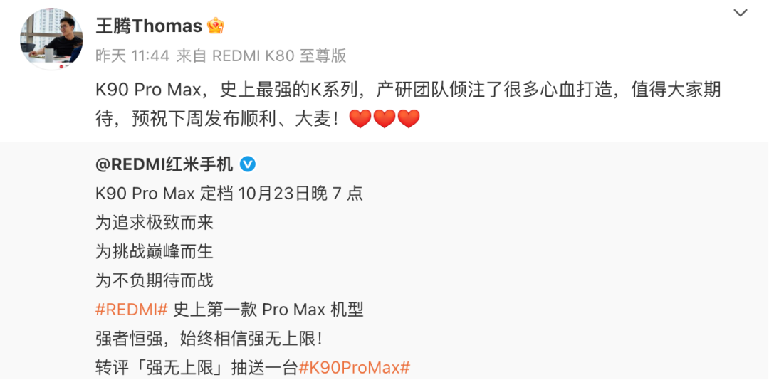 当天,王腾也在微博平台转发红米手机官方推文并表示:“K90 Pro Max,史上最强的K系列,产研团队倾注了很多心血打造,值得大家期待,预祝下周发布顺利、大麦!”