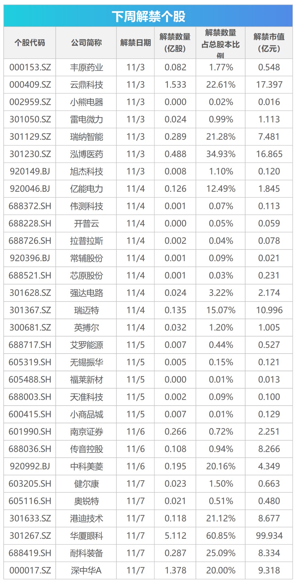 Wind数据显示,下周,限售股上市数量为10.28亿股,市值约为203.22亿元。华厦眼科是下周解禁市值最大的一家公司,华厦眼科将有5.11亿股限售股在11月7日到期,占总股本比例为60.85%,市值约为99.93亿元。