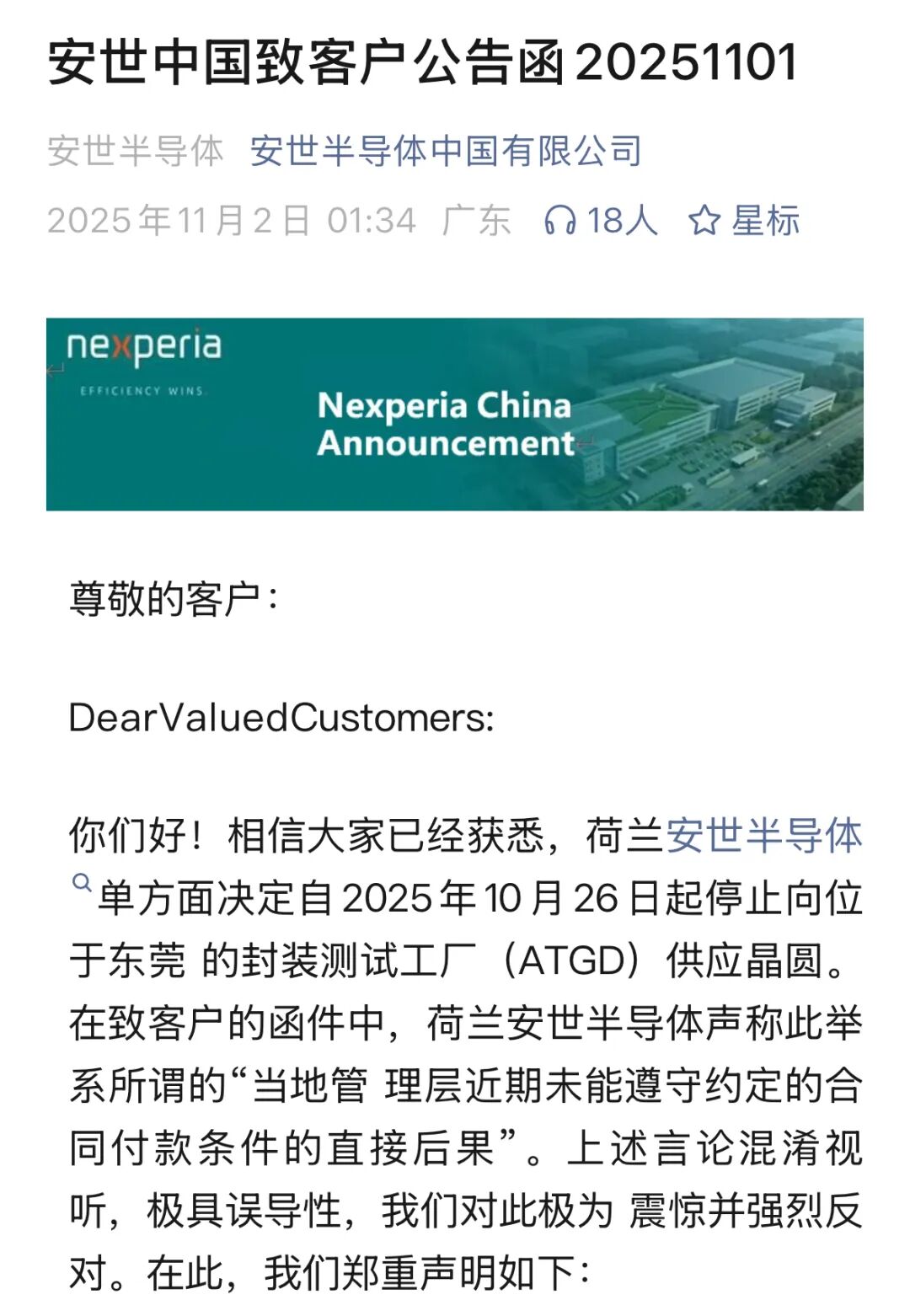 11月2日凌晨,安世半导体中国有限公司发布致客户公告函。