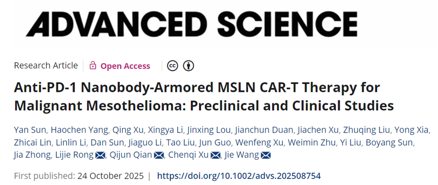 这项名为“纳米抗体装甲化CAR-T细胞(NAC-T)”的临床研究成果,已发表在最新一期出版的国际知名学术期刊《Advanced Science》(《先进科学》)。