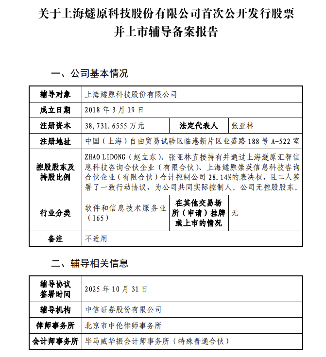 11月2日,中国证监会官网显示,上海燧原科技股份有限公司已启动上市辅导,由中信证券担任辅导机构。辅导备案报告显示,ZHAO LIDONG(赵立东)、张亚林直接持有并通过上海燧原汇智信息科技咨询合伙企业(有限合伙)、上海燧原崇英信息科技咨询合伙企业(有限合伙)合计控制公司28.14%的表决权,且二人签署了一致行动协议,为公司共同实际控制人。公司无控股股东。