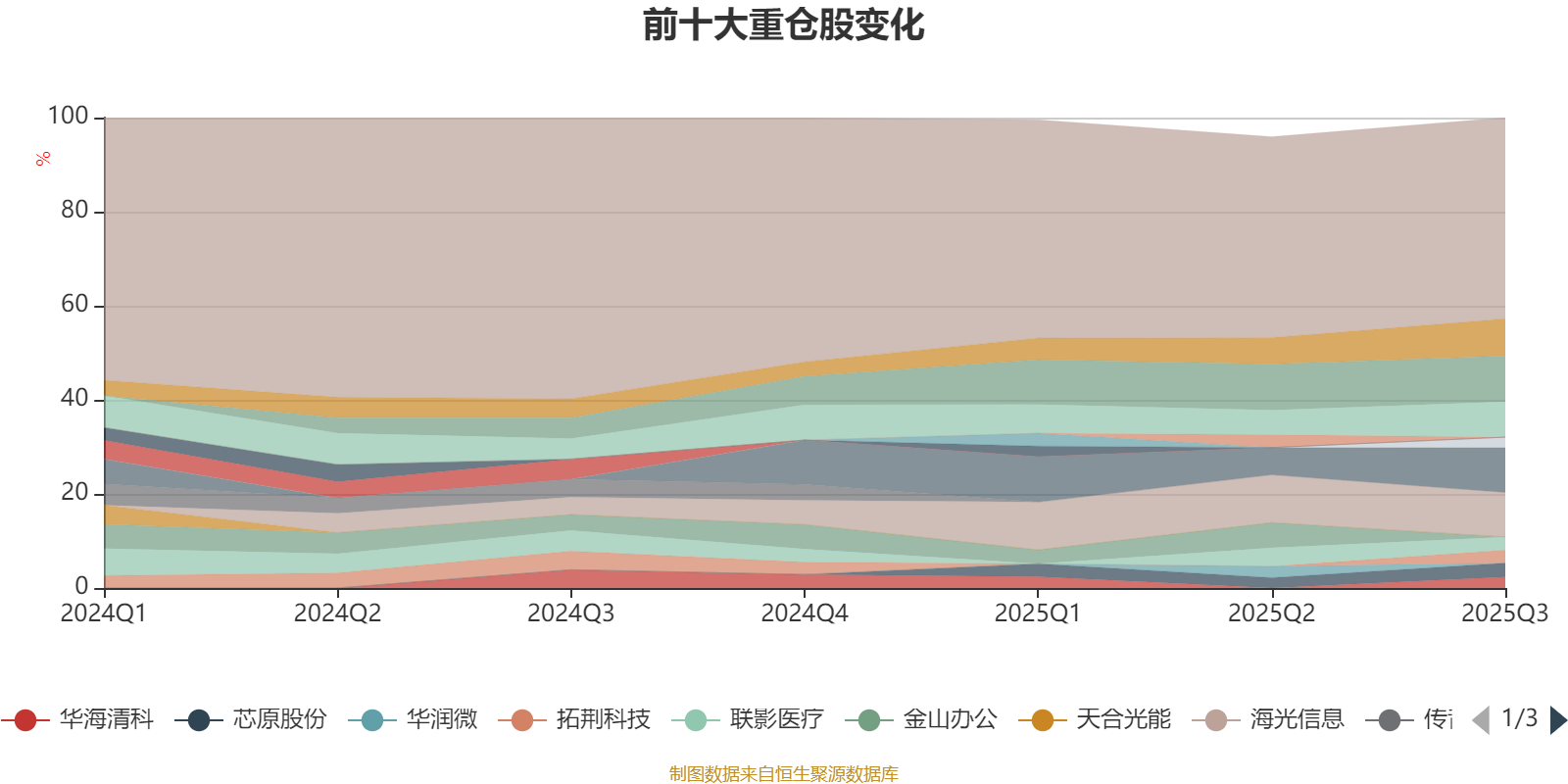 截至2025年三季度末,基金十大重仓股分别是寒武纪、中芯国际、海光信息、澜起科技、中微公司、芯原股份、联影医疗、拓荆科技、华海清科、佰维存储。