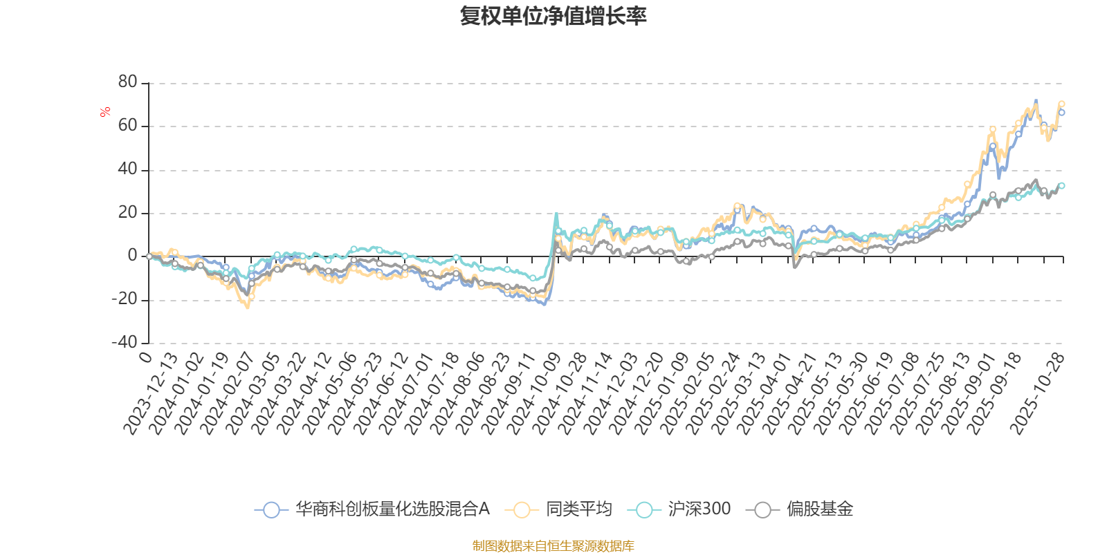 截至10月28日,华商科创板量化选股混合A近三个月复权单位净值增长率为41.08%,位于同类可比基金92/229;近半年复权单位净值增长率为49.45%,位于同类可比基金120/229;近一年复权单位净值增长率为51.53%,位于同类可比基金118/213。