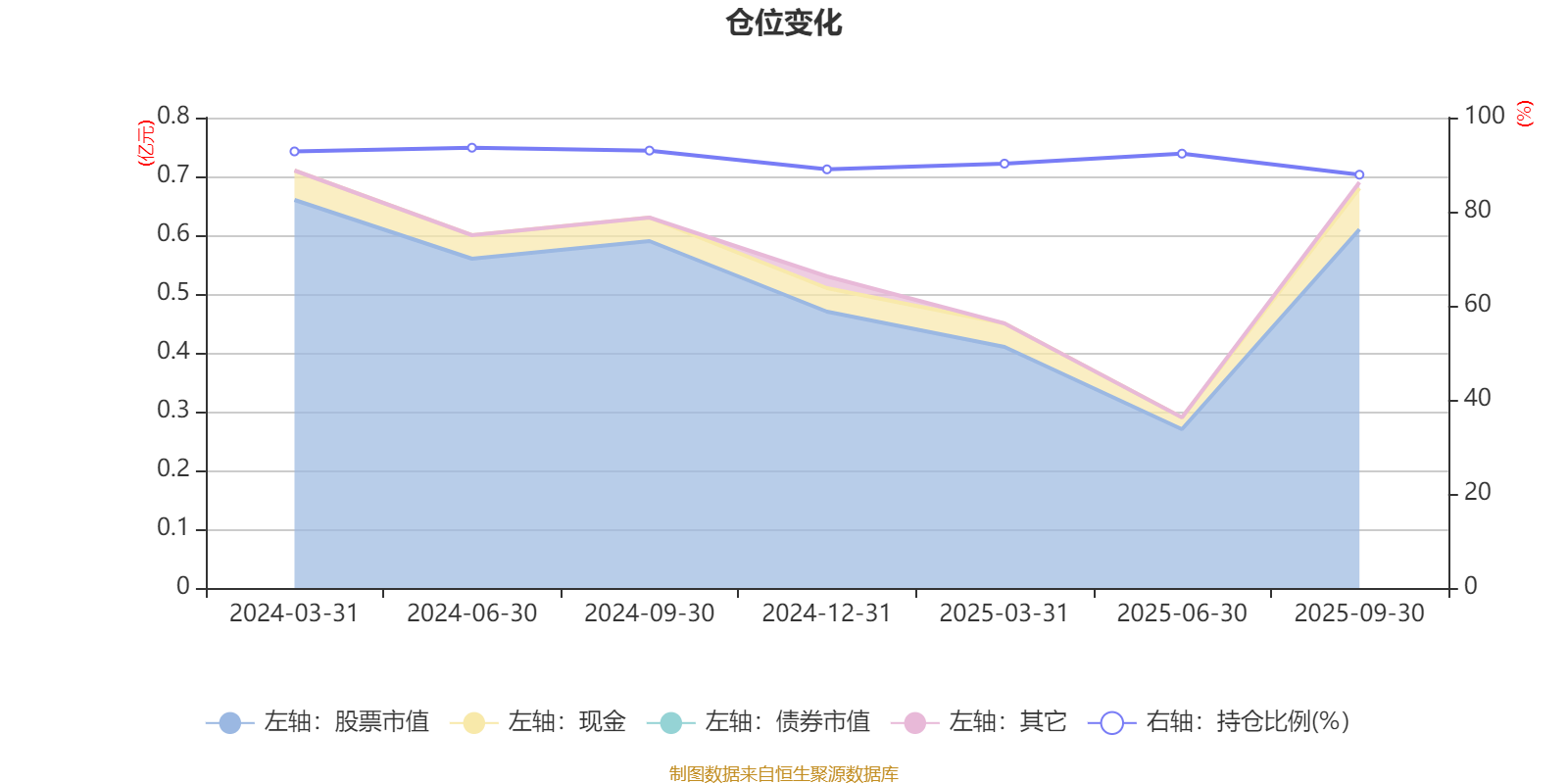 据定期报告数据统计,成立以来平均股票仓位为91.26%,同类平均为86.77%。2024年上半年末基金达到93.6%的最高仓位,2025年三季度末最低,为87.86%。