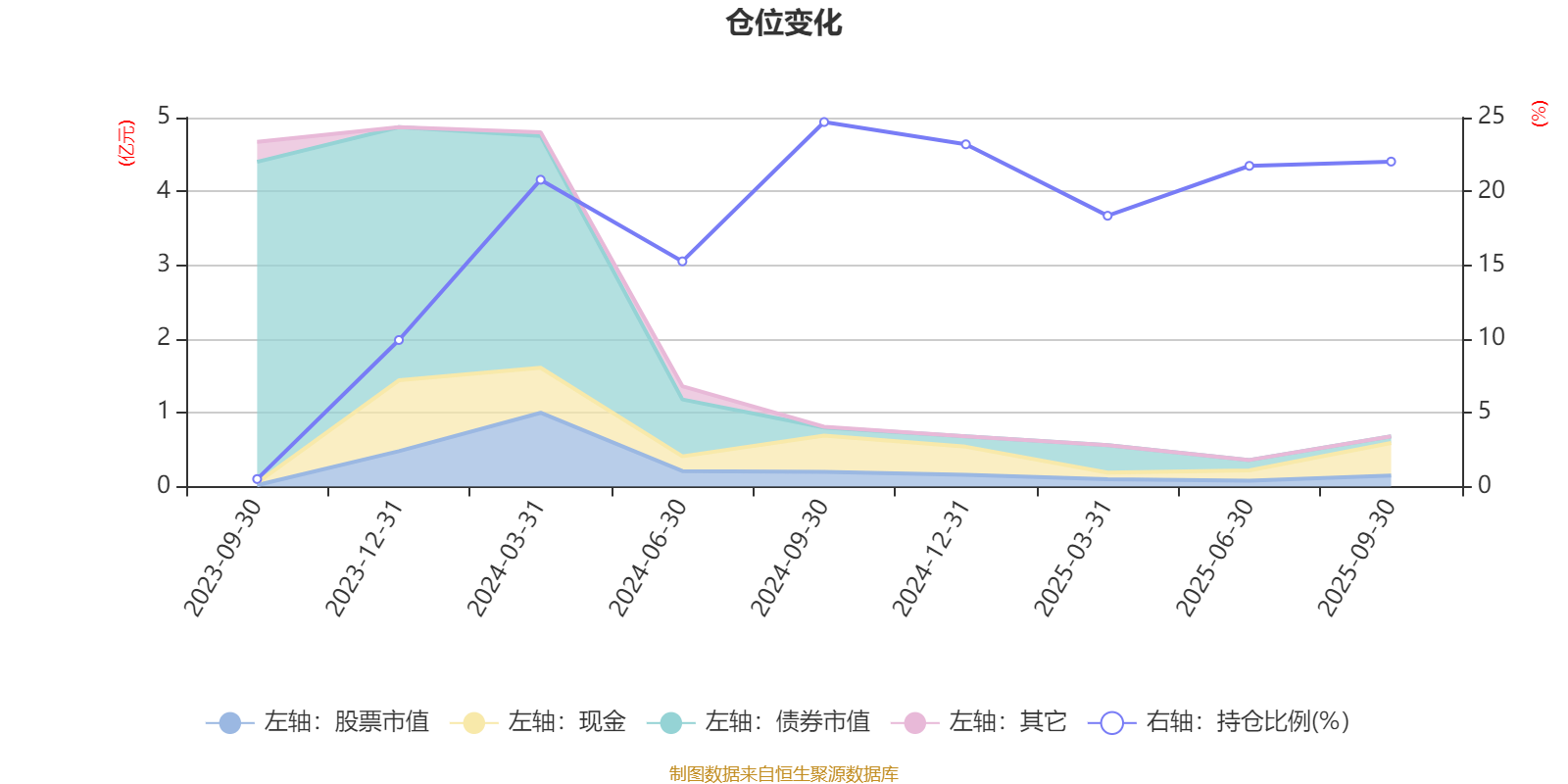 据定期报告数据统计,成立以来平均股票仓位为17.39%,同类平均为19.14%。2024年三季度末基金达到24.7%的最高仓位,2023年三季度末最低,为0.51%。