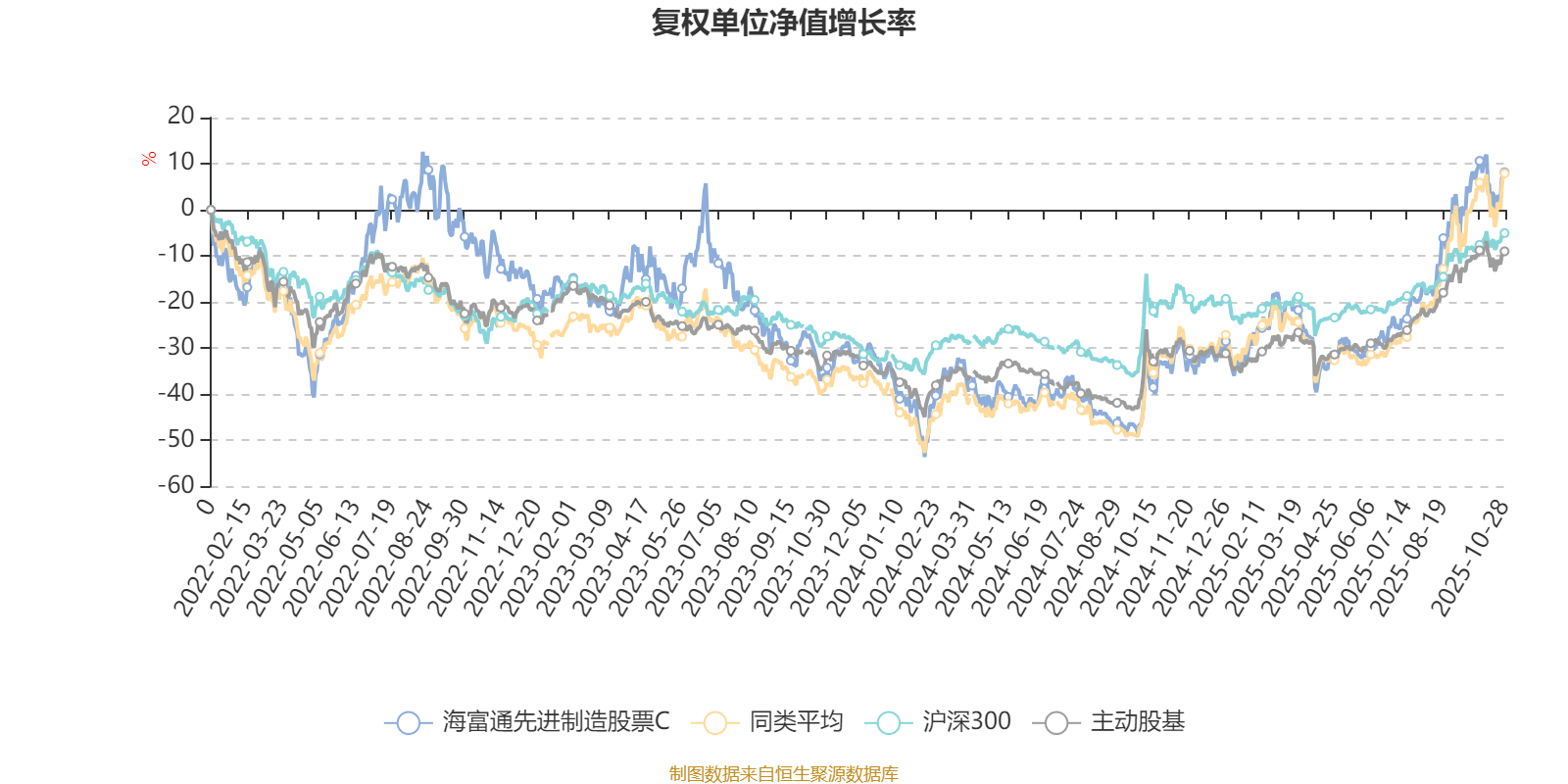 截至10月28日,海富通先进制造股票C近三个月复权单位净值增长率为32.94%,位于同类可比基金40/63;近半年复权单位净值增长率为59.68%,位于同类可比基金26/63;近一年复权单位净值增长率为61.15%,位于同类可比基金29/61;近三年复权单位净值增长率为25.38%,位于同类可比基金42/51。