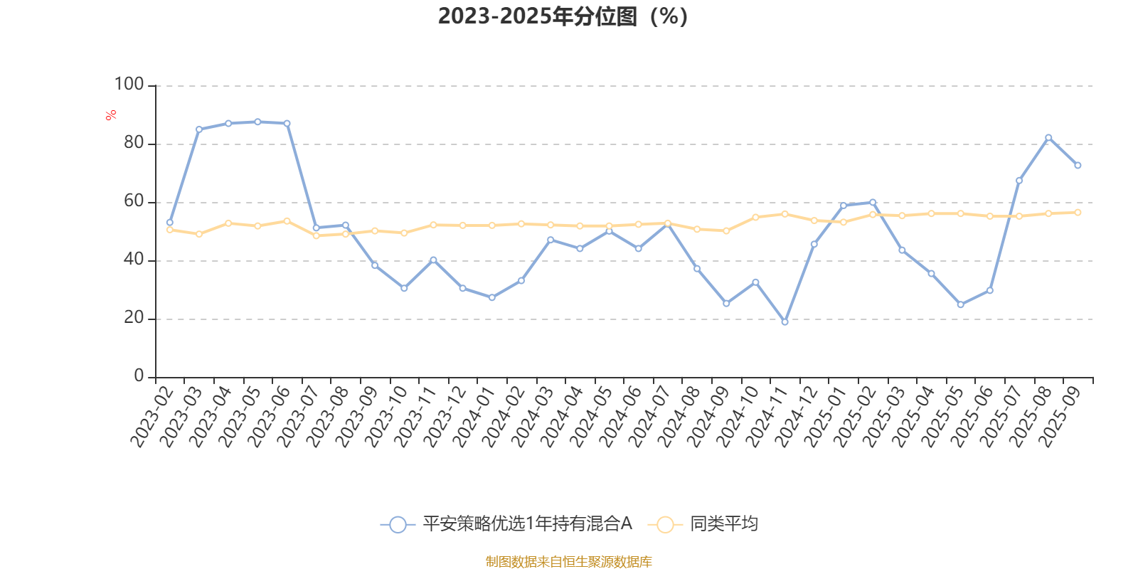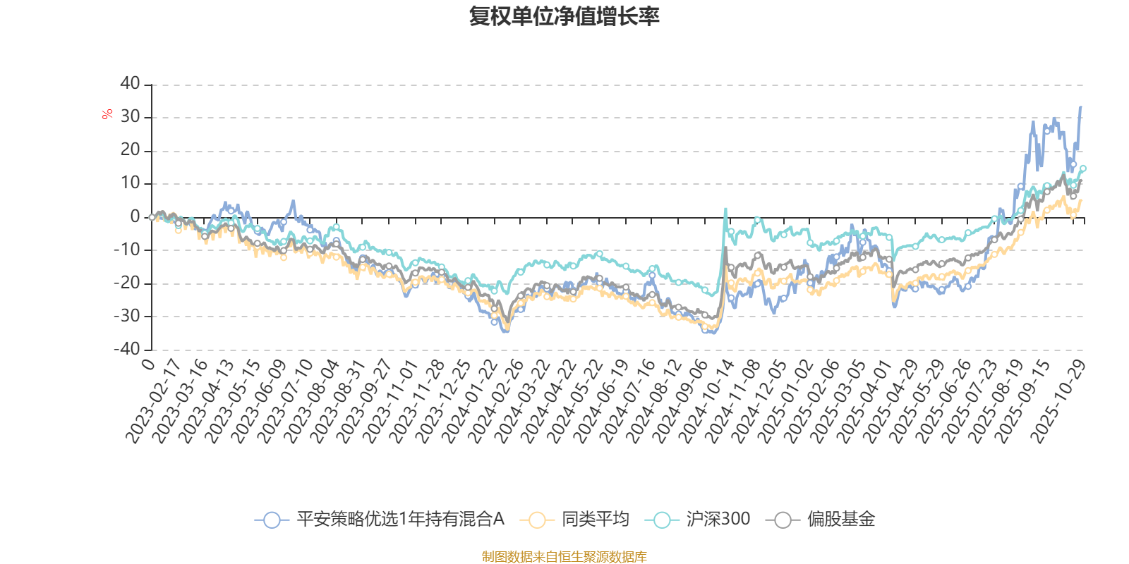截至10月28日,平安策略优选1年持有混合A近三个月复权单位净值增长率为34.52%,位于同类可比基金52/621;近半年复权单位净值增长率为71.15%,位于同类可比基金32/619;近一年复权单位净值增长率为73.06%,位于同类可比基金25/611。