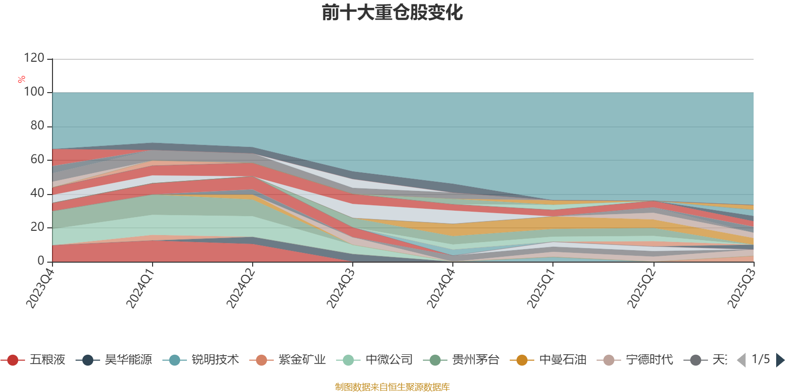 截至2025年三季度末,基金十大重仓股分别是长江电力、宁德时代、华钰矿业、新泉股份、紫金矿业、阿科力、新天然气、金诚信、华鲁恒升、寒武纪。