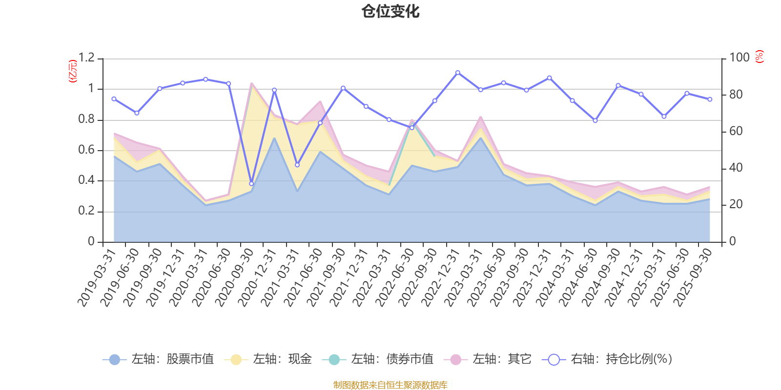 据定期报告数据统计,近三年平均股票仓位为80.89%,同类平均为72.35%。2022年末基金达到92.32%的最高仓位,2020年三季度末最低,为31.8%。