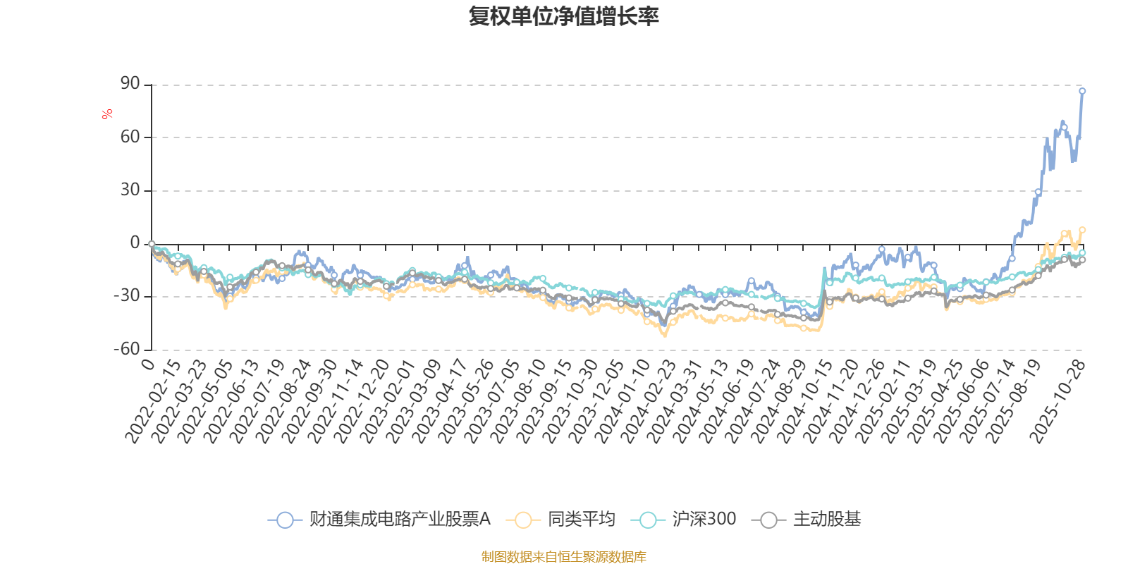 截至10月28日,财通集成电路产业股票A近三个月复权单位净值增长率为73.16%,位于同类可比基金1/63;近半年复权单位净值增长率为146.37%,位于同类可比基金1/63;近一年复权单位净值增长率为115.17%,位于同类可比基金1/61;近三年复权单位净值增长率为123.38%,位于同类可比基金3/51。
