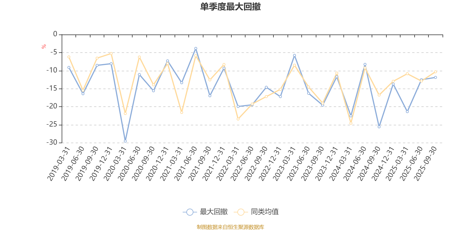 截至10月28日,基金近三年最大回撤为42.62%,同类可比基金排名22/51。单季度最大回撤出现在2020年一季度,为29.55%。