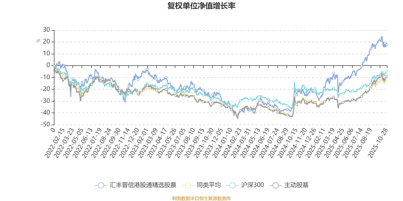 截至10月28日,汇丰晋信港股通精选股票近三个月复权单位净值增长率为11.46%,位于同类可比基金64/121;近半年复权单位净值增长率为36.48%,位于同类可比基金41/121;近一年复权单位净值增长率为50.04%,位于同类可比基金12/115;近三年复权单位净值增长率为69.07%,位于同类可比基金7/87。