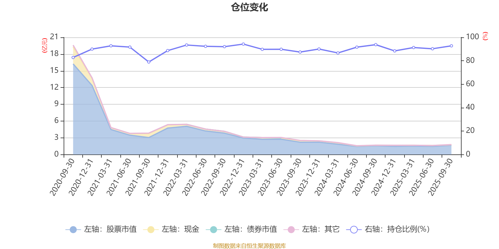 据定期报告数据统计,近三年平均股票仓位为90.52%,同类平均为88.27%。2022年末基金达到94.26%的最高仓位,2021年三季度末最低,为78.97%。