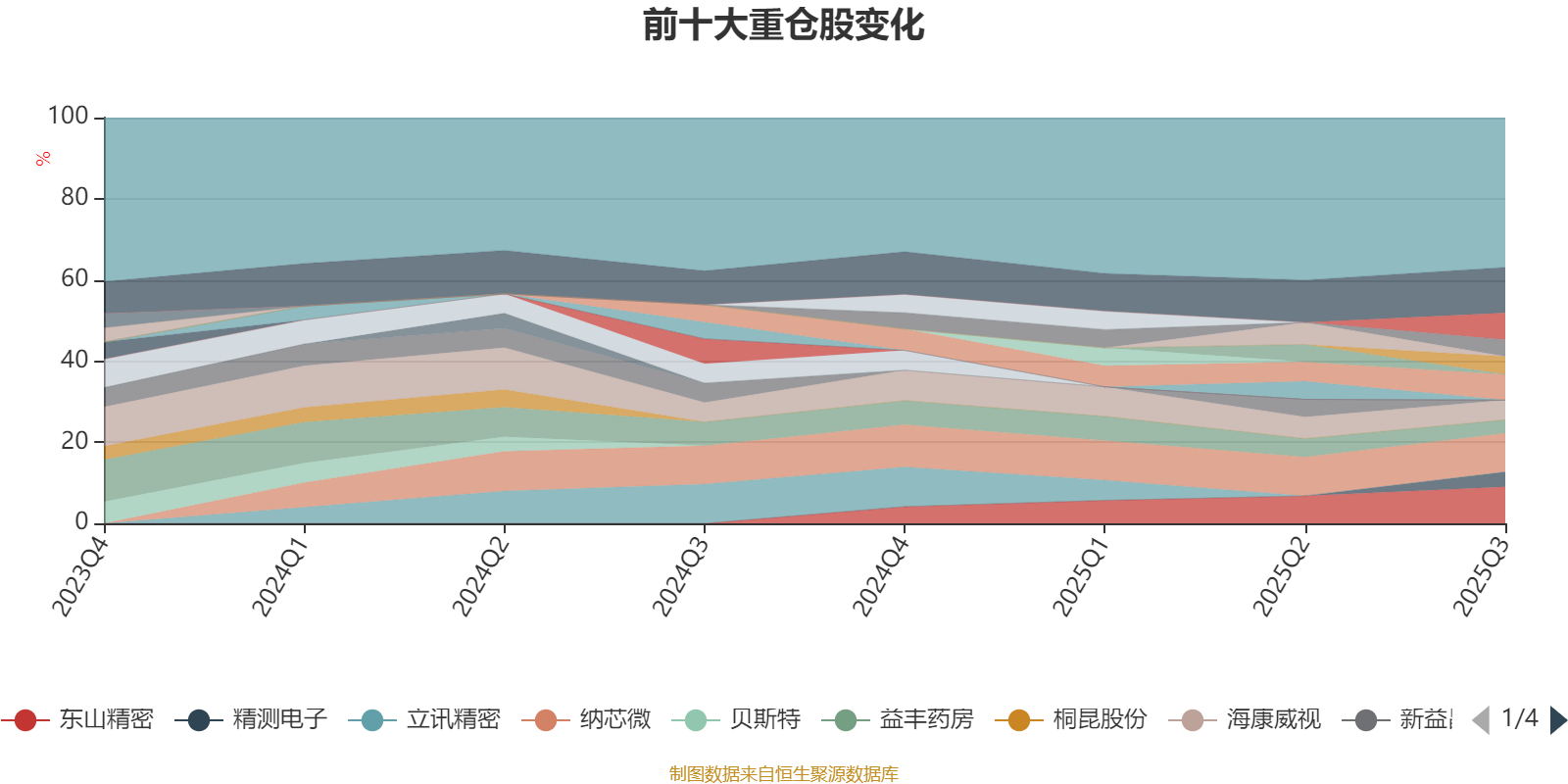 该基金持股集中度较高。截至2025年三季度末,基金十大重仓股分别是兆易创新、纳芯微、东山精密、南芯科技、歌尔股份、海康威视、涛涛车业、蓝思科技、精测电子、益丰药房。