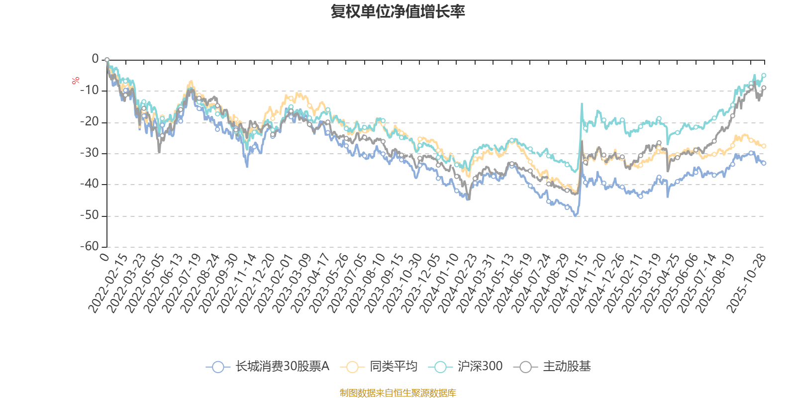 截至10月28日,长城消费30股票A近三个月复权单位净值增长率为4.49%,位于同类可比基金12/43;近半年复权单位净值增长率为8.98%,位于同类可比基金15/43;近一年复权单位净值增长率为7.52%,位于同类可比基金16/43;近三年复权单位净值增长率为0.19%,位于同类可比基金23/40。