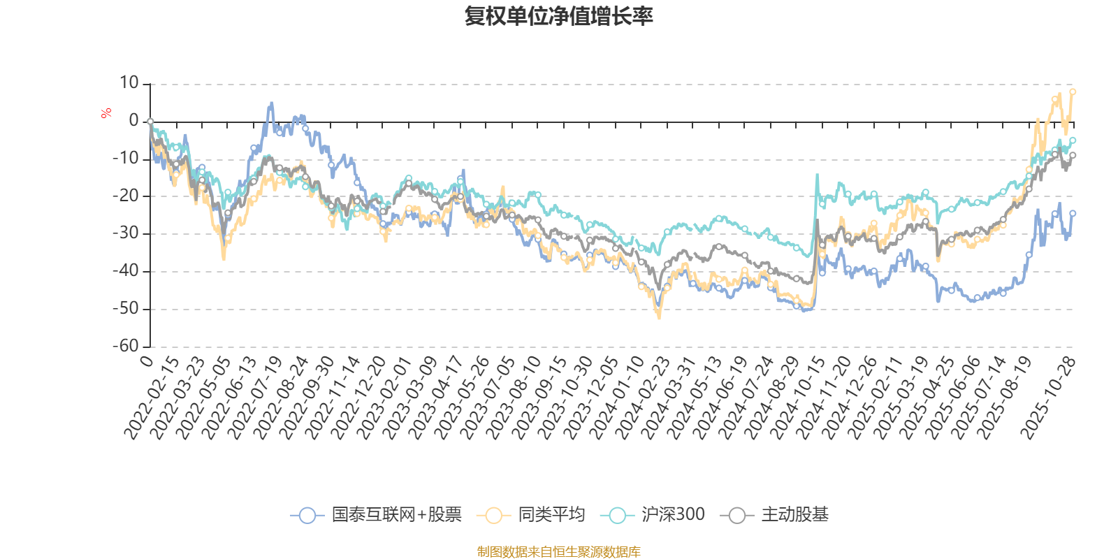 截至10月28日,国泰互联网+股票近三个月复权单位净值增长率为32.65%,位于同类可比基金41/63;近半年复权单位净值增长率为37.29%,位于同类可比基金44/63;近一年复权单位净值增长率为21.04%,位于同类可比基金57/61;近三年复权单位净值增长率为-14.04%,位于同类可比基金51/51。