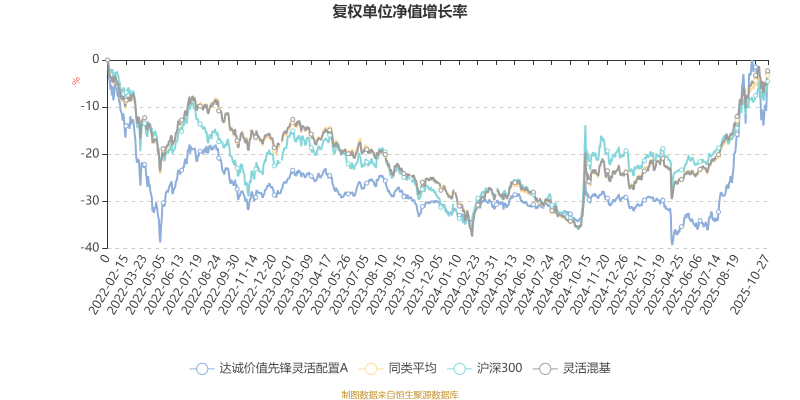截至10月27日,达诚价值先锋灵活配置A近三个月复权单位净值增长率为36.14%,位于同类可比基金116/1287;近半年复权单位净值增长率为50.27%,位于同类可比基金160/1287;近一年复权单位净值增长率为35.48%,位于同类可比基金306/1287;近三年复权单位净值增长率为39.59%,位于同类可比基金245/1286。