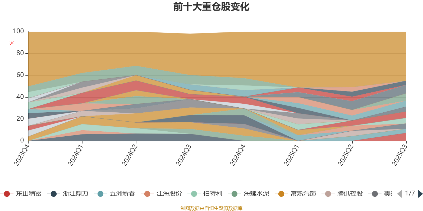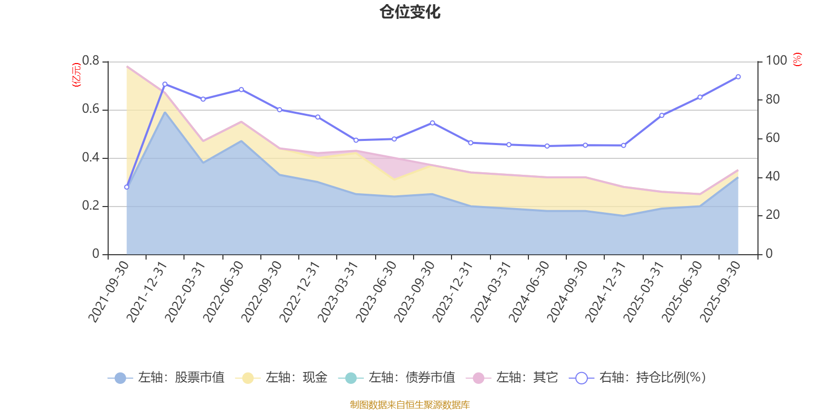 据定期报告数据统计,近三年平均股票仓位为65.69%,同类平均为72.35%。2025年三季度末基金达到92.09%的最高仓位,2021年三季度末最低,为34.93%。