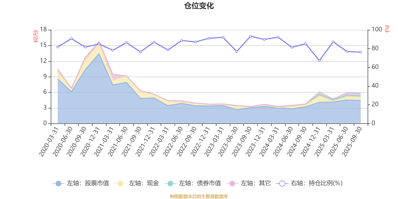 据定期报告数据统计,近三年平均股票仓位为84.09%,同类平均为83.73%。2023年三季度末基金达到93.22%的最高仓位,2024年末最低,为67.22%。