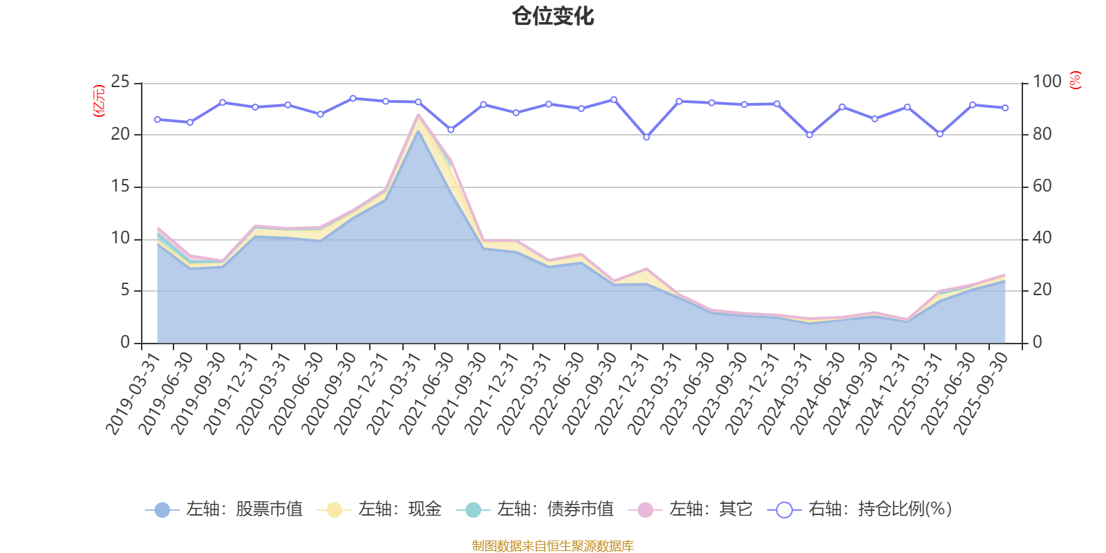 据定期报告数据统计,近三年平均股票仓位为88.21%,同类平均为88.27%。2020年三季度末基金达到94.08%的最高仓位,2022年末最低,为79.18%。
