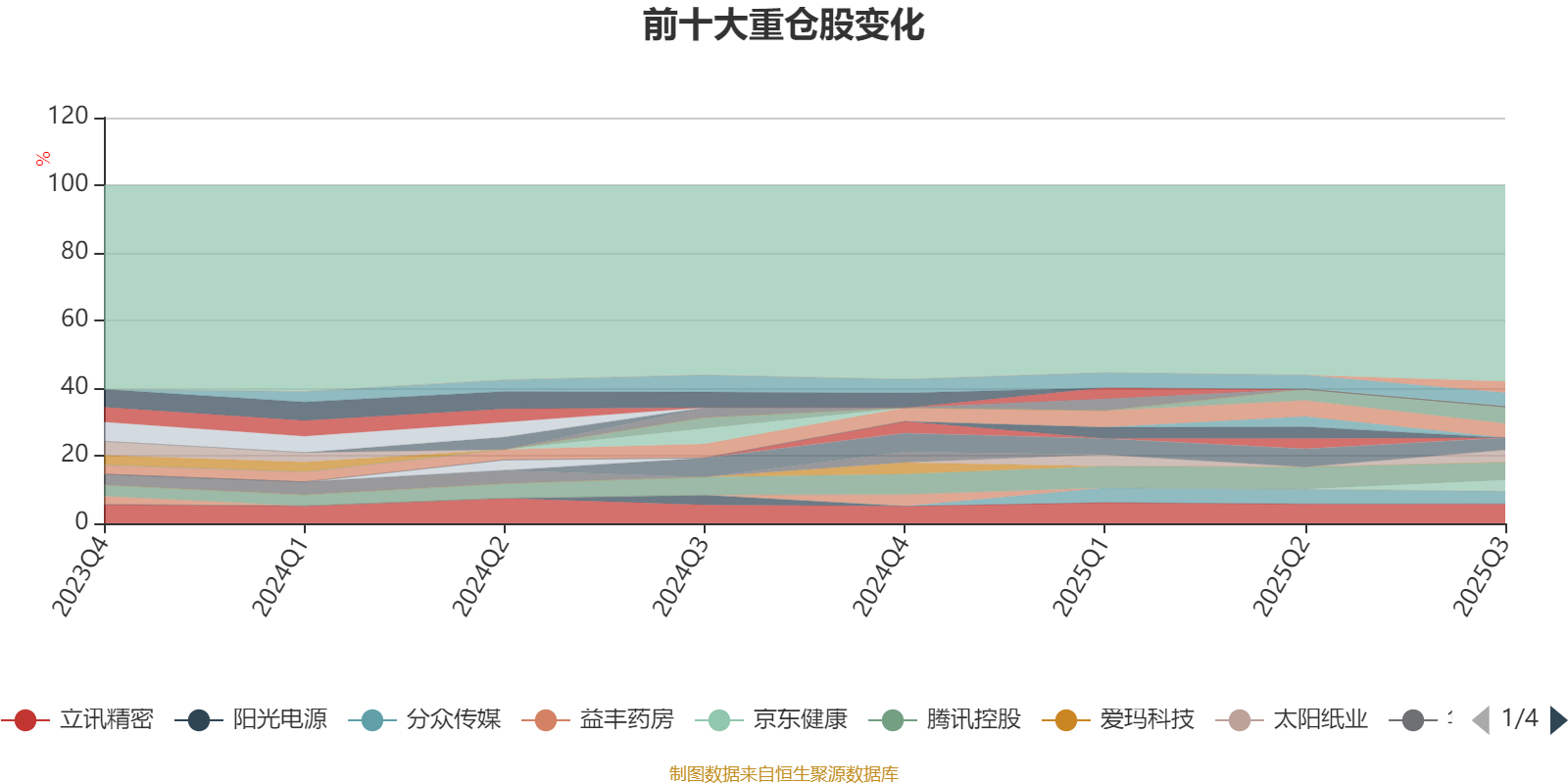 截至2025年三季度末,基金十大重仓股分别是立讯精密、腾讯控股、信达生物、安踏体育、华鲁恒升、分众传媒、太阳纸业、浦发银行、九方智投控股、京东健康。