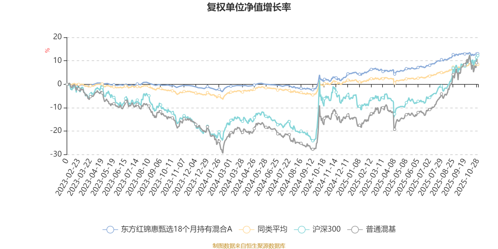 截至10月28日,东方红锦惠甄选18个月持有混合A近三个月复权单位净值增长率为2.41%,位于同类可比基金311/629;近半年复权单位净值增长率为6.99%,位于同类可比基金203/629;近一年复权单位净值增长率为10.92%,位于同类可比基金114/623。