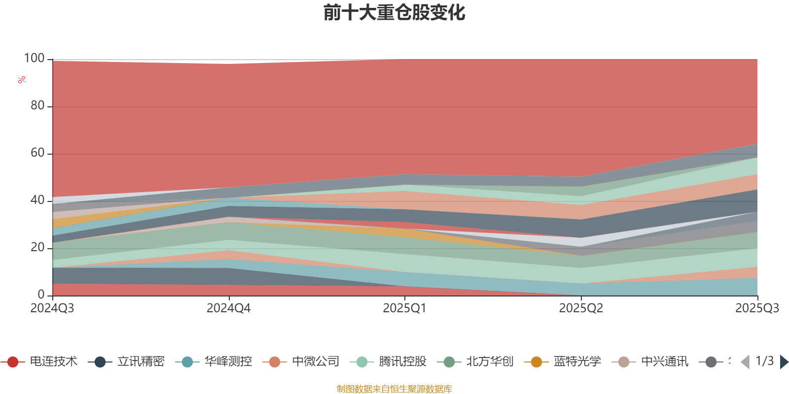 基金管理人在三季报中表示,回顾三季度,我们的组合继续聚焦泛科技板块,包括互联网、半导体等。我们对国内产业升级的长期前景保持乐观,但结构上有所调整,减配了海外终端链条,增配了国产化链条。