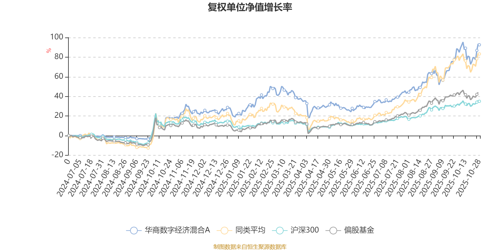 截至10月28日,华商数字经济混合A近三个月复权单位净值增长率为33.51%,位于同类可比基金121/229;近半年复权单位净值增长率为48.48%,位于同类可比基金125/229;近一年复权单位净值增长率为64.11%,位于同类可比基金77/213。