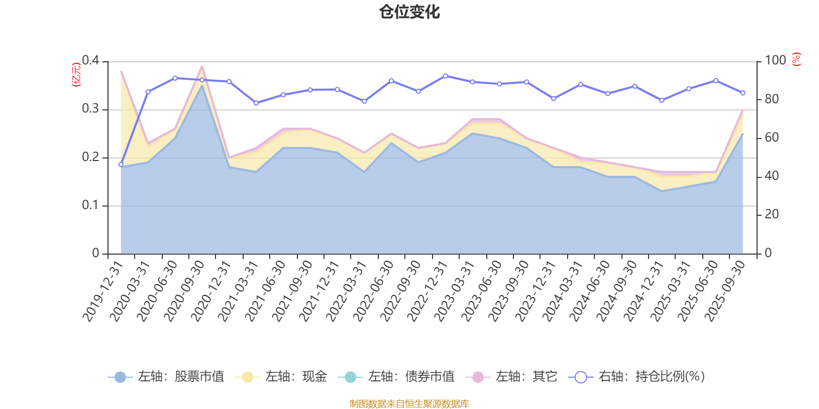 据定期报告数据统计,近三年平均股票仓位为86.46%,同类平均为83.73%。2022年末基金达到92.42%的最高仓位,2019年末最低,为46.42%。