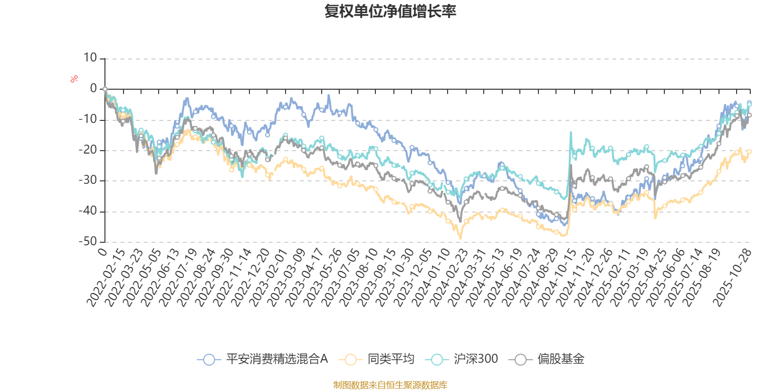 截至10月28日,平安消费精选混合A近三个月复权单位净值增长率为15.65%,位于同类可比基金276/689;近半年复权单位净值增长率为33.60%,位于同类可比基金243/688;近一年复权单位净值增长率为46.16%,位于同类可比基金100/653;近三年复权单位净值增长率为16.91%,位于同类可比基金176/364。