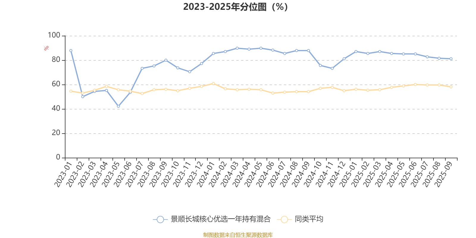 通过所选区间该基金净值增长率分位图,可以观察该基金与同类基金业绩比较情况。图为坐标原点到区间内某时点的净值增长率在同类基金中的分位数。