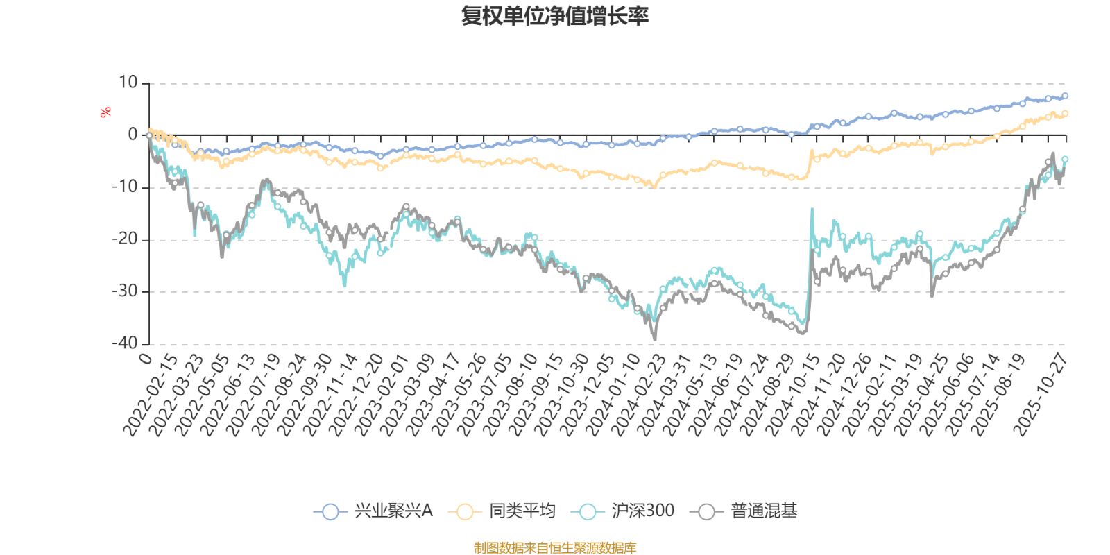 截至10月27日,兴业聚兴A近三个月复权单位净值增长率为1.90%,位于同类可比基金373/629;近半年复权单位净值增长率为3.42%,位于同类可比基金475/629;近一年复权单位净值增长率为5.66%,位于同类可比基金425/623;近三年复权单位净值增长率为10.78%,位于同类可比基金302/557。