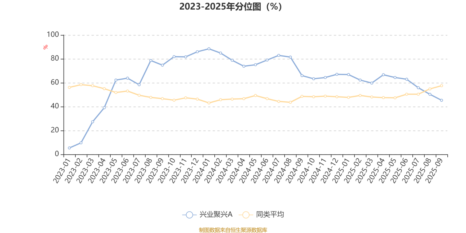 通过所选区间该基金净值增长率分位图,可以观察该基金与同类基金业绩比较情况。图为坐标原点到区间内某时点的净值增长率在同类基金中的分位数。