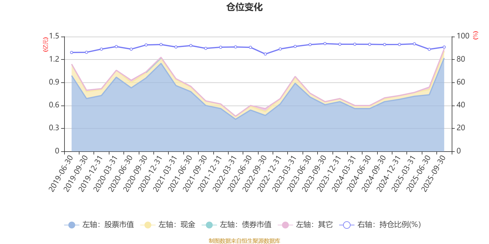 据定期报告数据统计,近三年平均股票仓位为92.29%,同类平均为86.77%。2023年三季度末基金达到93.91%的最高仓位,2022年三季度末最低,为84.84%。
