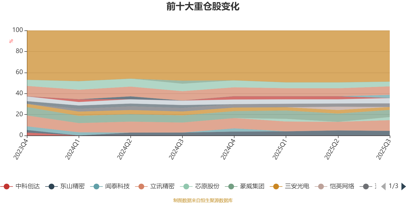 该基金持股集中度较高,且持股标的较为稳定。截至2025年三季度末,基金十大重仓股分别是立讯精密、京东方A、豪威集团、歌尔股份、TCL科技、东山精密、蓝思科技、瑞芯微、芯原股份、三安光电。