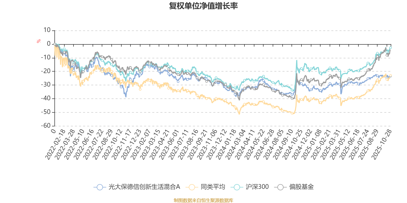 截至10月28日,光大保德信创新生活混合A近三个月复权单位净值增长率为1.98%,位于同类可比基金573/621;近半年复权单位净值增长率为9.49%,位于同类可比基金580/619;近一年复权单位净值增长率为7.17%,位于同类可比基金570/611;近三年复权单位净值增长率为23.08%,位于同类可比基金223/518。