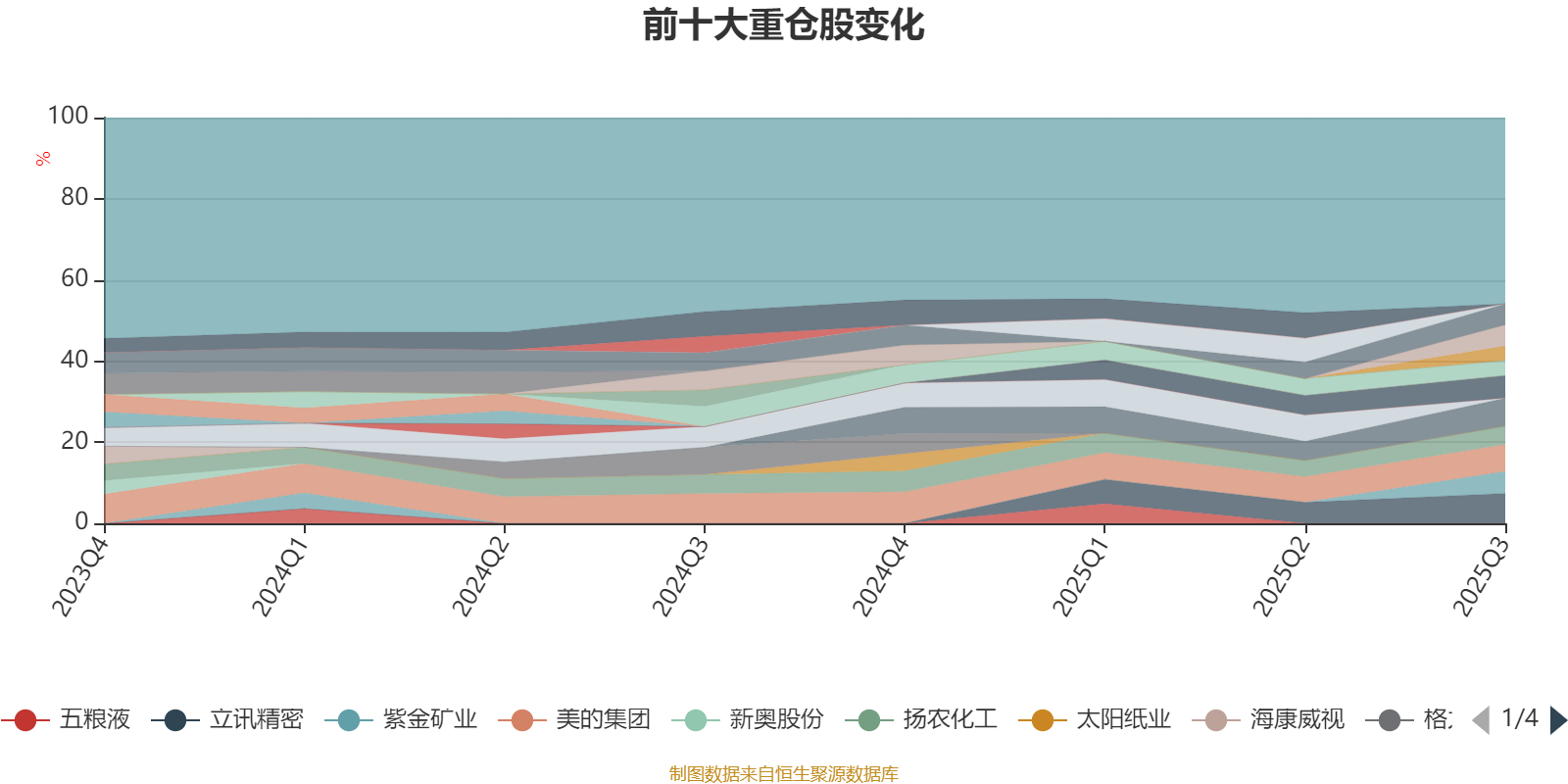 截至2025年三季度末,基金十大重仓股分别是立讯精密、宁德时代、美的集团、药明康德、紫金矿业、中国平安、华鲁恒升、扬农化工、伊利股份、山金国际。