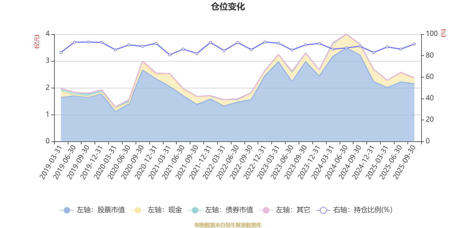 据定期报告数据统计,近三年平均股票仓位为88.42%,同类平均为88.27%。2019年三季度末基金达到92.7%的最高仓位,2021年一季度末最低,为80.75%。