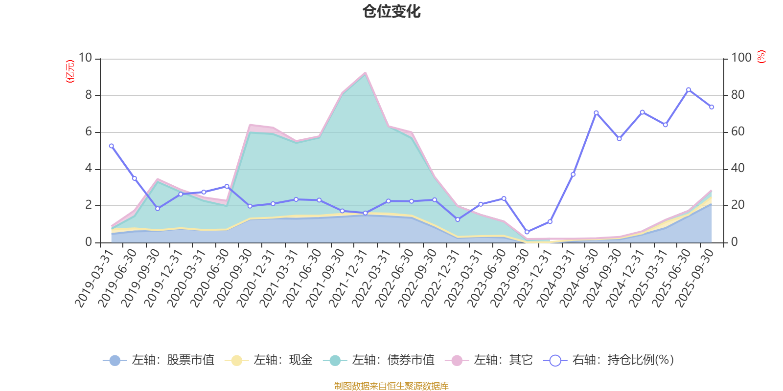 据定期报告数据统计,近三年平均股票仓位为44.23%,同类平均为72.35%。2025年上半年末基金达到83.13%的最高仓位,2023年三季度末最低,为5.85%。