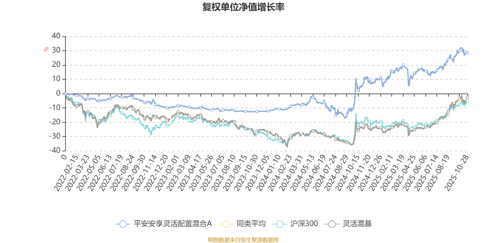 截至10月28日,平安安享灵活配置混合A近三个月复权单位净值增长率为8.56%,位于同类可比基金770/1287;近半年复权单位净值增长率为13.35%,位于同类可比基金948/1287;近一年复权单位净值增长率为21.70%,位于同类可比基金635/1287;近三年复权单位净值增长率为38.27%,位于同类可比基金266/1286。