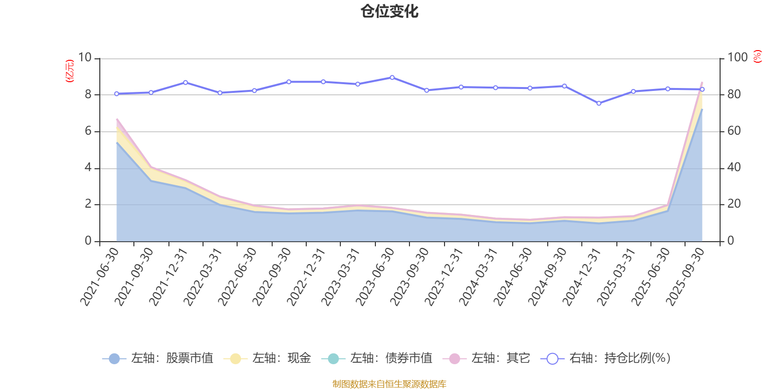 据定期报告数据统计,近三年平均股票仓位为83.83%,同类平均为85.66%。2023年上半年末基金达到89.56%的最高仓位,2024年末最低,为75.45%。
