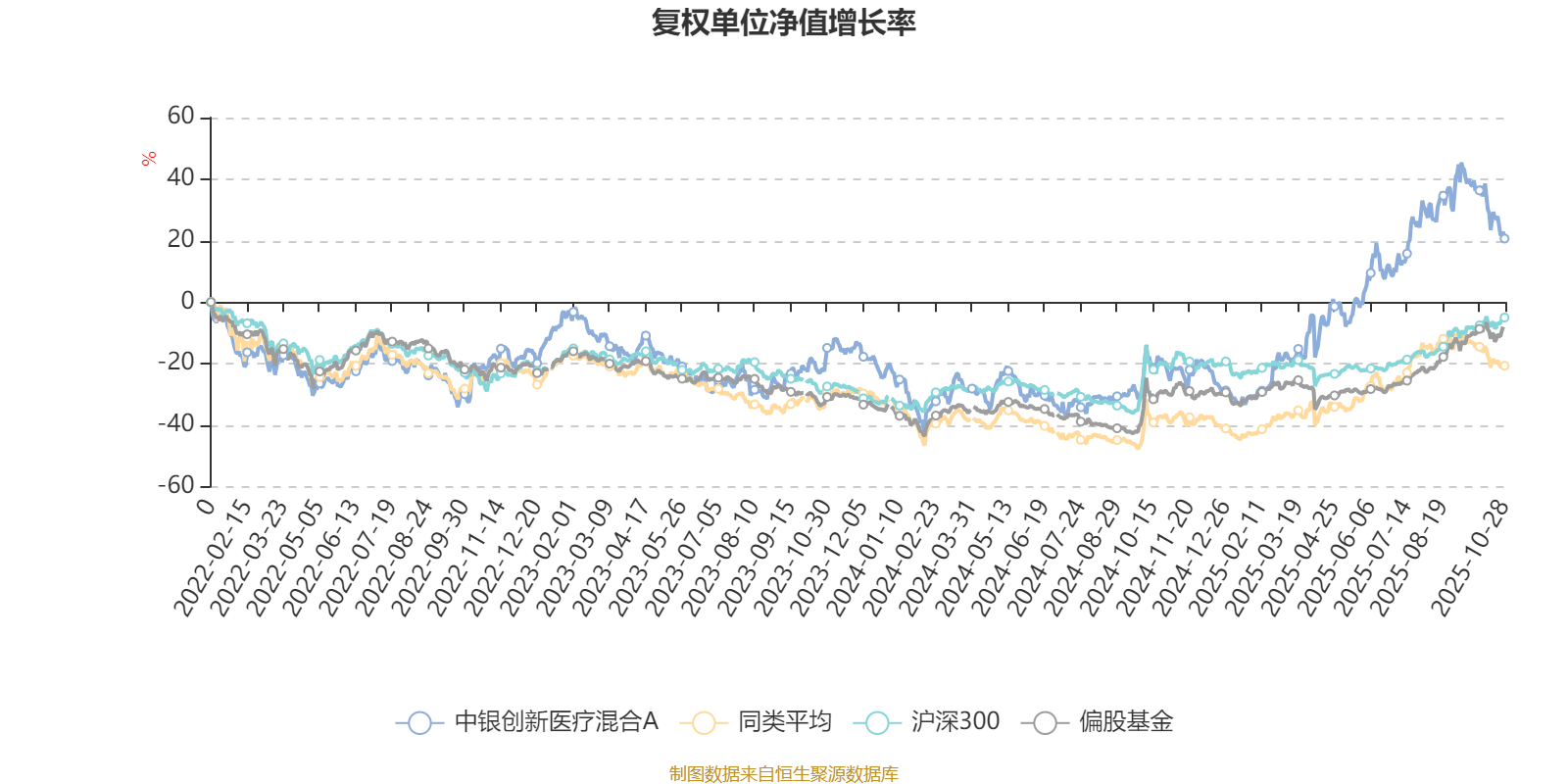 截至10月28日,中银创新医疗混合A近三个月复权单位净值增长率为-6.20%,位于同类可比基金57/106;近半年复权单位净值增长率为22.94%,位于同类可比基金41/104;近一年复权单位净值增长率为52.07%,位于同类可比基金10/101;近三年复权单位净值增长率为57.05%,位于同类可比基金6/75。