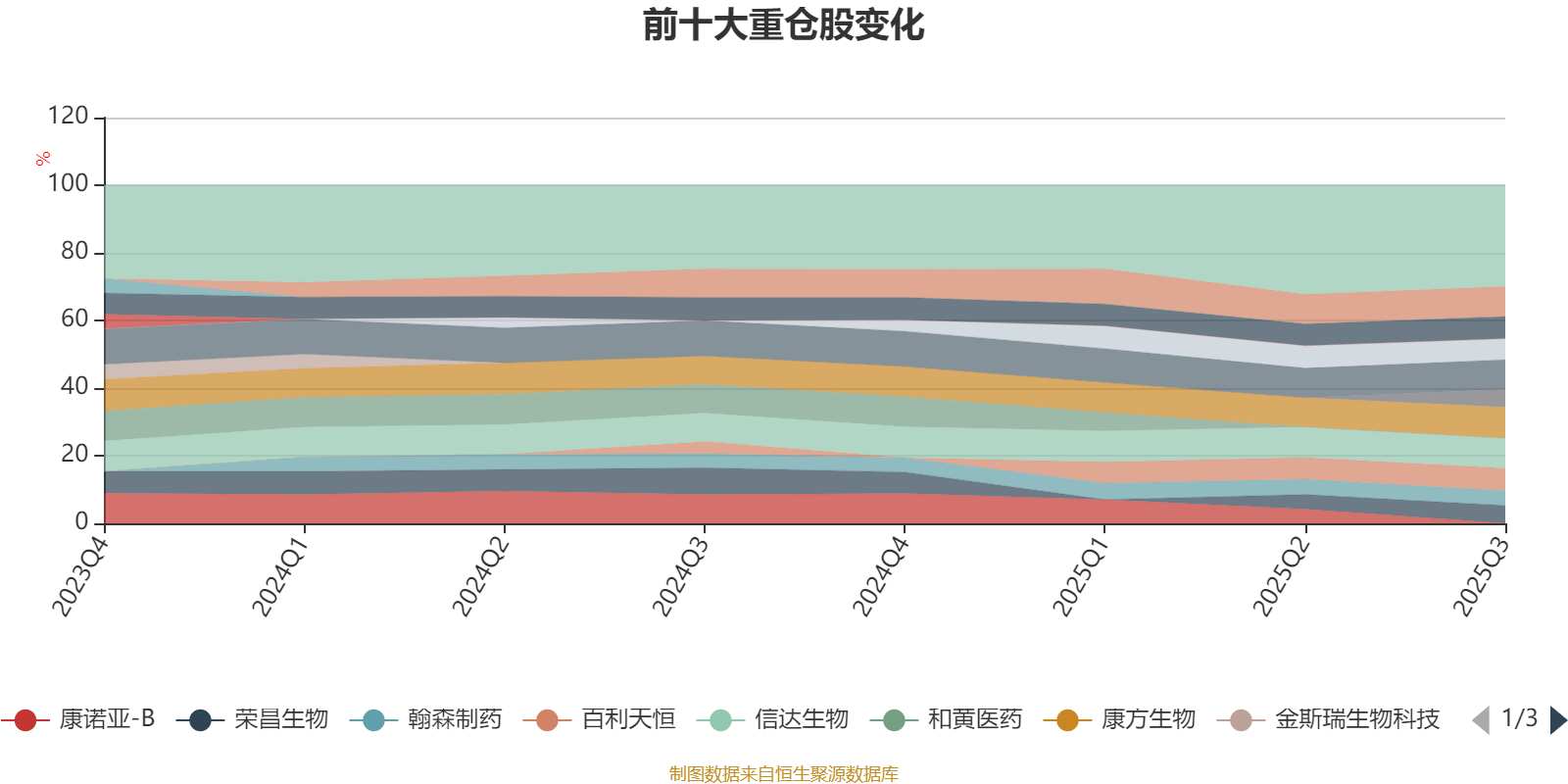 该基金持股集中度较高,近2年前十大重仓股集中度长期超过60%。截至2025年三季度末,基金十大重仓股分别是康方生物、科伦博泰生物-B、信达生物、恒瑞医药、百利天恒、百济神州、新诺威、荣昌生物、映恩生物-B、翰森制药。