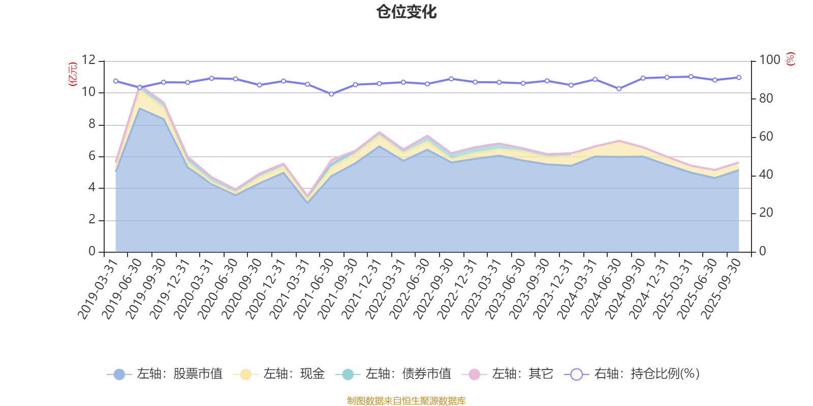 据定期报告数据统计,近三年平均股票仓位为89.51%,同类平均为88.27%。2025年一季度末基金达到91.78%的最高仓位,2021年上半年末最低,为82.65%。