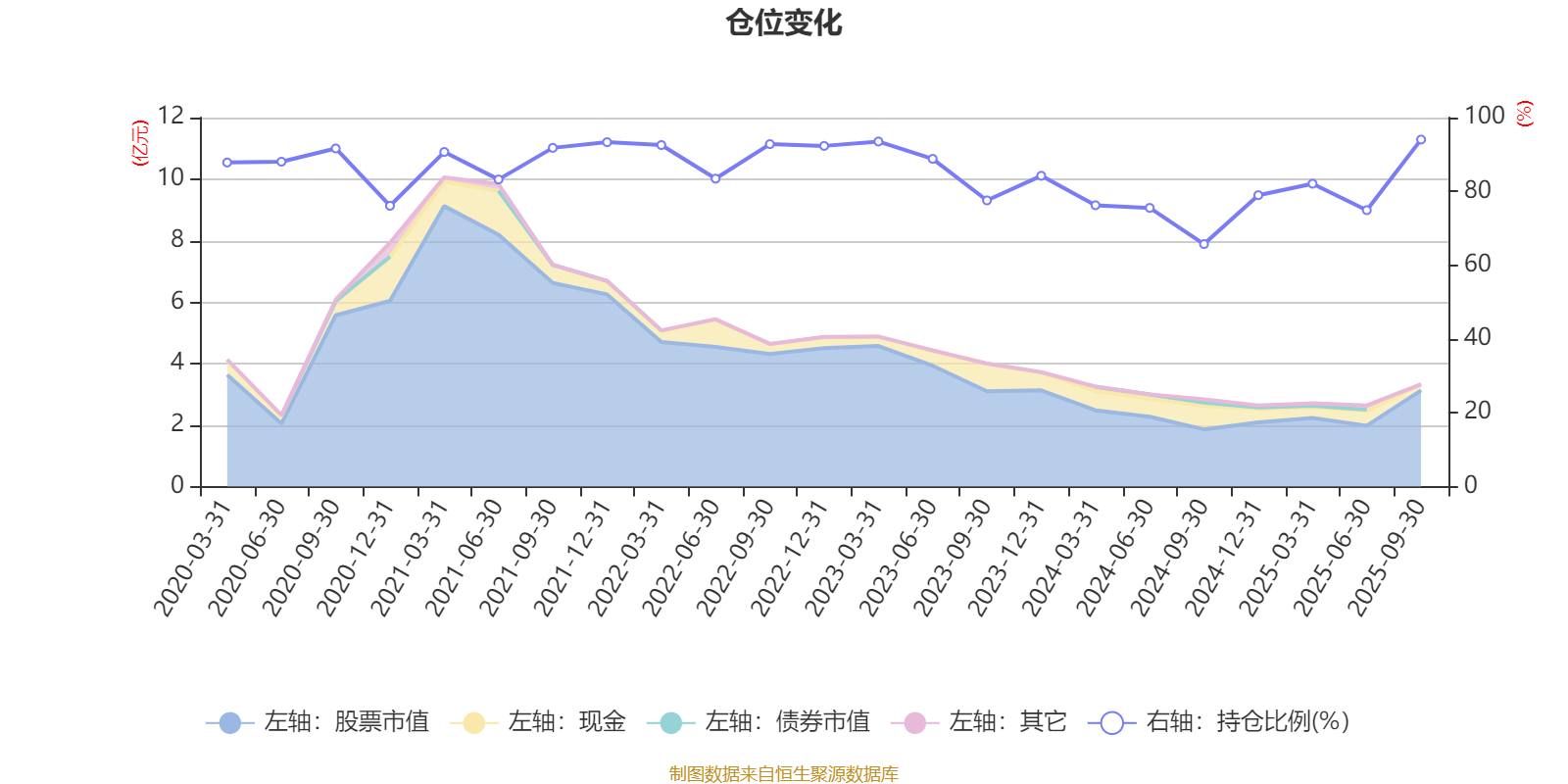 据定期报告数据统计,近三年平均股票仓位为82%,同类平均为85.66%。2025年三季度末基金达到94.05%的最高仓位,2024年三季度末最低,为65.72%。