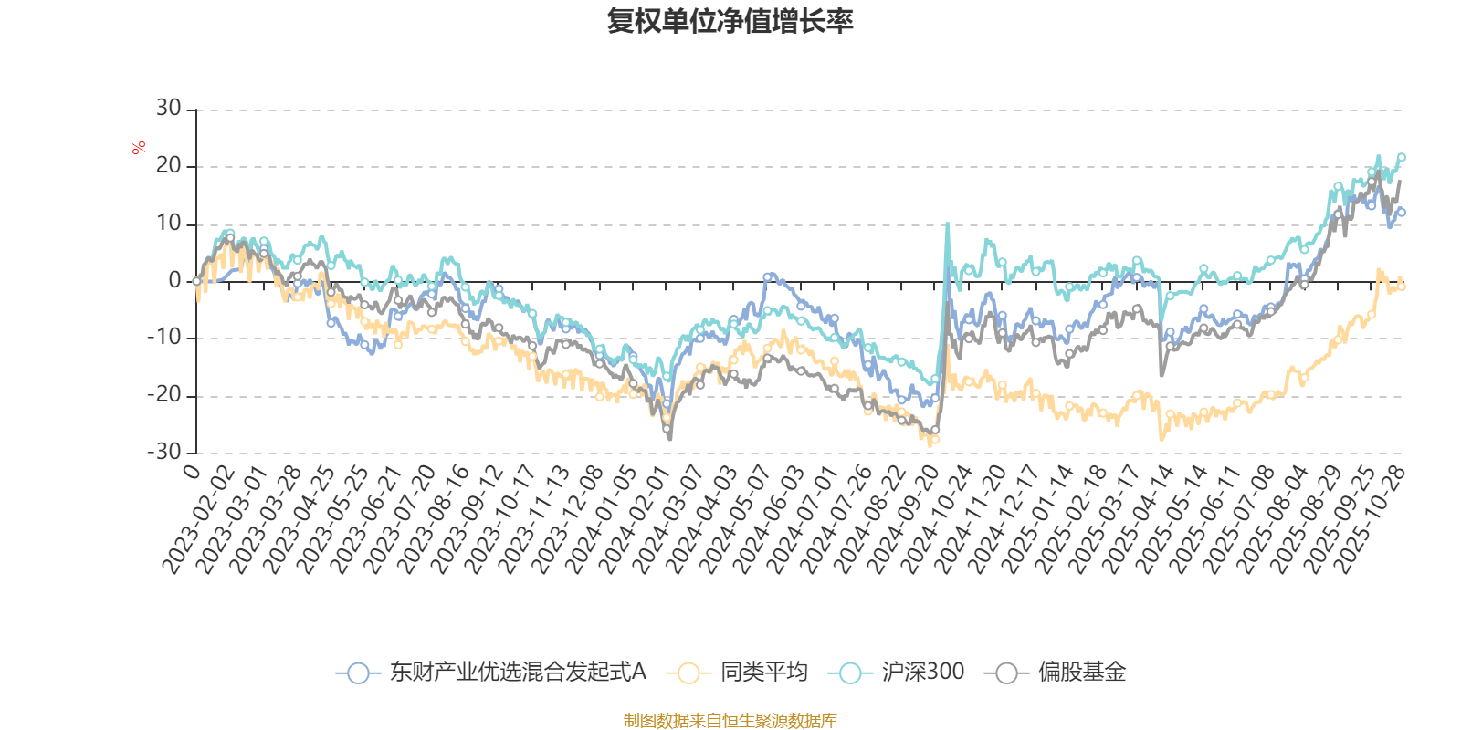 截至10月28日,东财产业优选混合发起式A近三个月复权单位净值增长率为9.13%,位于同类可比基金39/49;近半年复权单位净值增长率为23.05%,位于同类可比基金34/49;近一年复权单位净值增长率为17.64%,位于同类可比基金35/42。