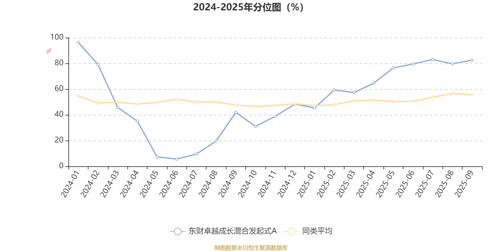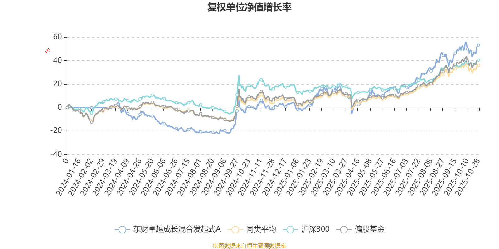 截至10月28日,东财卓越成长混合发起式A近三个月复权单位净值增长率为19.34%,位于同类可比基金198/689;近半年复权单位净值增长率为45.93%,位于同类可比基金105/688;近一年复权单位净值增长率为52.88%,位于同类可比基金64/653。